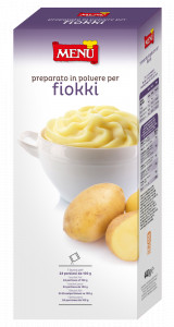 Gebrauchsfertige Flocken dehydrierter Kartoffeln. Äußerst vielseitiges Produkt hervorragender Qualität. Ausgezeichnet zu Fleischgerichten. Kann auch mit der „Polentera“ (Maschine für die Zubereitung von Polenta) zubereitet werden. 1,5 Liter Wasser mit 1 EL Salz zum Kochen bringen. 1 Liter Milch und 440 g Pulverzubereitung für Fiokki dazugeben. Das Produkt 1 Minute lang quellen lassen und nach Belieben Grana-Käse einrühren