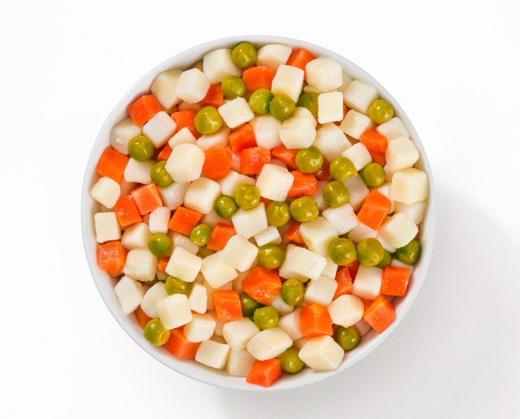 In Würfel geschnittene Kartoffeln und Karotten unter Zugabe von Erbsen, in Salzlake eingelegt. Besonders empfohlen als Beilage und für Russischem Salat.