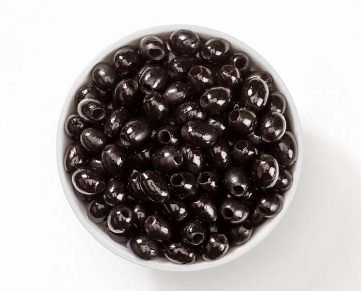 Entsteinte schwarze Oliven, Größe 24–26, natur in Salzlake eingelegt. Besonders geeignet für den Pizzabelag.