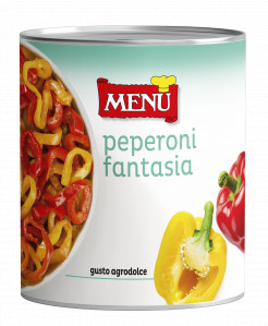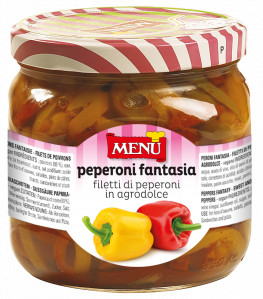 Frische rote und gelbe Paprikaschoten, in Streifen geschnitten und süß-sauer in Essig und Öl eingelegt. Perfekt für Vorspeisenteller und für den Sandwich-, Tramezzini- und Pizzabelag.
