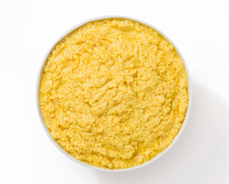 Leckeres, aromatisches Pesto aus Orangenfruchtfleisch und -schale, Zitronenschale, ganzen gerösteten Mandeln, Grana Padano g.U., mit Öl emulsioniert.