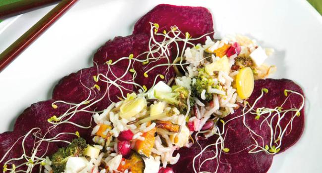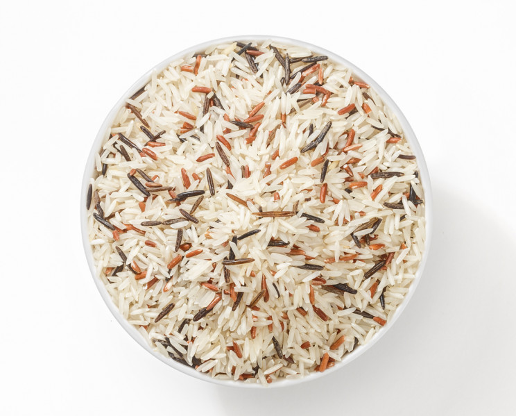 Mischung aus hinsichtlich Form, Farbe und Konsistenz unterschiedlicher Bestandteile: Basmatireis, roter Reis und Wasserreis (Zizania acquatica). Für leckere Sommersalate. 10 Minuten in kochendem Wasser kochen.