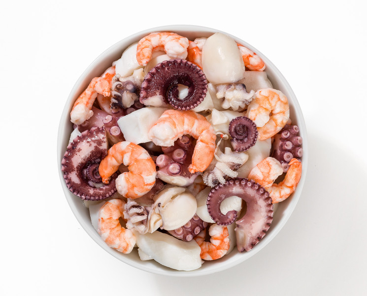 Zubereitung aus Pfeilkalmaren, Kraken, Tintenfischen und Garnelen in Weinessig und Zitronensaft. Zarter, dennoch fester Fisch ohne Knorpel, sauber geschnitten und gereinigt.