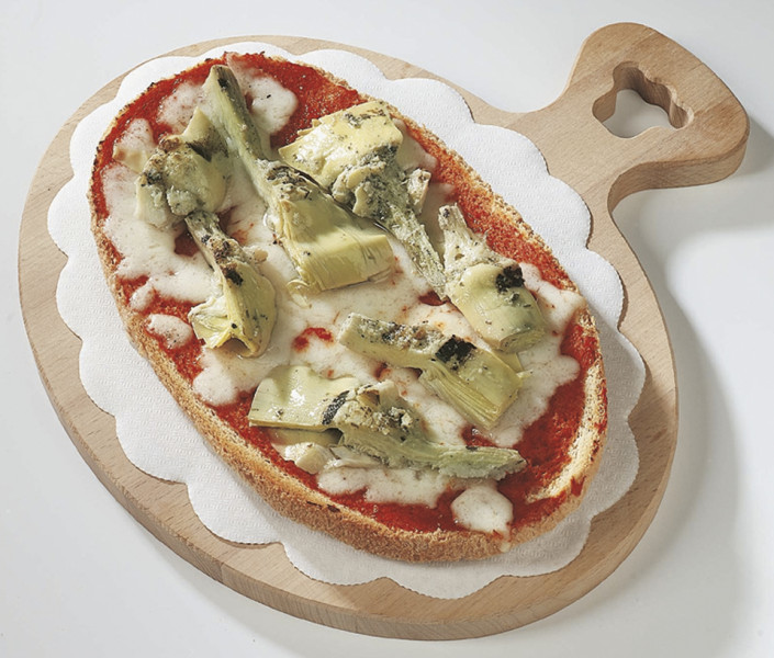 Das Brot mit nativem Olivenöl extra rösten. Abkühlen lassen. Die passierten Tomaten darauf verteilen und den Käse für Bruschetta...Mia hinzufügen. Wieder für 2-3 Minuten in den Ofen schieben. Die halbierten gegrillten Artischocken dazugeben, weitere 2 Minuten erhitzen und servieren.