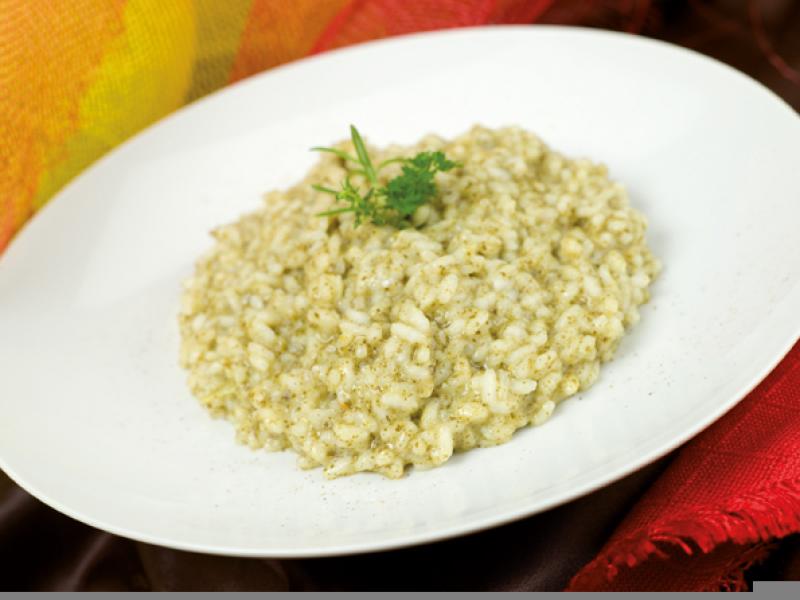 Die Schalotte fein hacken und in einer Pfanne mit Öl anbraten. Den Reis dazugeben, anrösten, mit dem Wein ablöschen und diesen verdampfen lassen. Nach und nach eine Kelle kochende Gemüsebrühe hinzugeben und den Reis auf großer Flamme kochen. Nach dem Kochen die Brennnesselcreme hinzugeben, die Butter und die Grancrema mit Parmesan einrühren und gegebenenfalls mit Salz abschmecken.