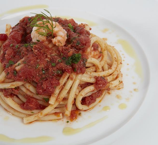 Kochen Sie die Bucatini in reichlich Salzwasser. In einer großen Pfanne mit etwas Öl eine Knoblauchzehe und eine in kleine Stücke geschnittene Chillischote anbraten. Krabbenfleischsauce und Garnelen hinzufügen. Die Bucatini in die Sauce geben und heiß servieren, dazu gehackte Petersilie und etwas Öl.
