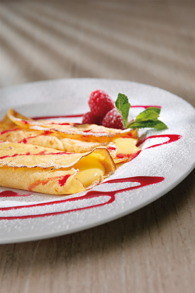 Preparare la Crema pasticcera stemperando il prodotto Menù con il latte freddo. Nel frattempo grattugiare la scorza dell'arancia e montare la panna con l'aiuto di una frusta elettrica. Incorporare nella Crema pasticcera la panna montata, la scorza d'arancia grattugiata e un poco di Grand Marnier. Amalgamare il composto con cura e lasciarlo riposare in frigorifero. A questo punto confezionare le Crêpes miscelando il Preparato Menù con l'acqua e cuocendo le crespelle nell'apposita crêpière. Farcire le Crêpes con la crema chantilly all'arancia e trasferirle in un piatto accompagnate dai lamponi ben sgocciolati dal loro succo di conservazione. Decorare con la Glassa ai frutti di bosco e completare con una spolverata di zucchero a velo.