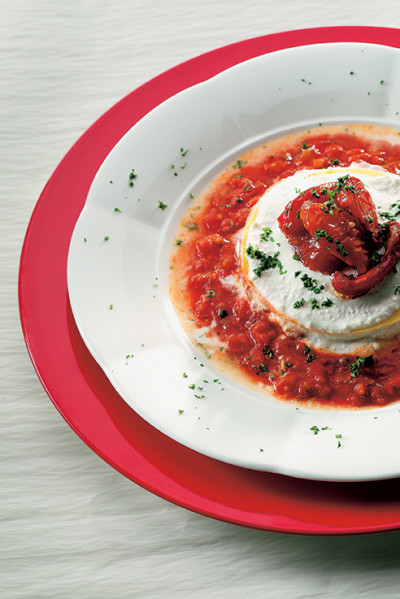 Mischen Sie die Zubereitung für Menù Crêpes mit 600g Wasser, bis eine homogene Masse entsteht. Stellen Sie eine mit dem Stück Butter gefettete Antihaftpfanne auf das Feuer und bereiten Sie 18 Crêpe mit dem zuvor erhaltenen Teig zu. Zu diesem Zeitpunkt in einer Schüssel den Ricotta mit der Kochcreme mischen. Passen Sie die Mischung aus Pfeffer und Salz an. Einen Esslöffel Pomosilico auf einem Glatten Teller verteilen und ein Crêpe darauf legen. Mehr Pomosilico und etwas Ricottacreme darauf verteilen. Mit einem weiteren Crêpe bedecken und die Füllung mit Pomosilico und Ricottacreme wiederholen. Mit einem dritten Crêpe versiegeln und mit den in Scheiben geschnittenen Soleggiati-Tomaten und einer Prise gehackter Petersilie dekorieren. Nach dem gleichen Verfahren erhalten sie weitere fünf Portionen, die jeweils auf eine einzelne Platte gelegt werden und im Mikrowellenherd erhitzt werden sollen. Sofort Servieren.