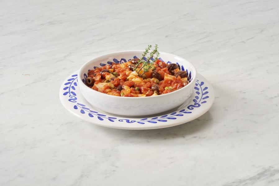 Den Fisch würfelig schneiden, Pomodorina, die Kapern und Leccino-Oliven dazugeben. Mit frischen Rosmarin- und Salbeiblättern aromatisieren.