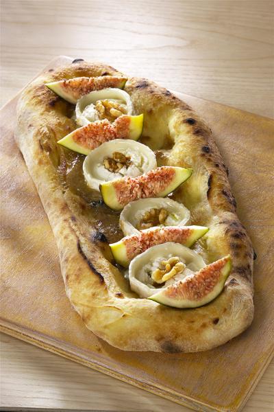 Realizzare una focaccia preparata con grano arso e un filo di Olio extravergine di oliva e metterla in forno. In uscita stendere uno strato di Salsa di noci, decorare con tomini di caprino e noci ed aggiungere i fichi freschi tagliati a spicchi.