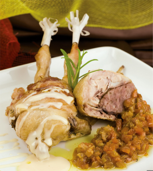Die Wachteln mit der Bratwurst füllen, jede Wachtel in einer Scheibe Speck einrollen und mit Küchengarn fest zubinden, mit Kräutersalz, Knoblauch, Rosmarin und Pfeffer würzen. In einer Pfanne mit heißem Öl gehackte Zwiebel, Sellerie und Kar otten anbraten. Die Wachteln hinzufügen und gut braten, mit Brandy abschmecken. So lang wie nötig kochen und mit Brühe benetzen. Die Wachteln mit der Soße servieren und mit „Grancrema Scamorza