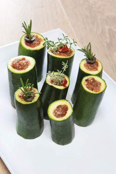 Das Hackfleisch mit der Menù-Salsadoro vermischen und würzen. Die Enden der Zucchini abschneiden und diese in gleich lange Stücke schneiden. Die Zucchini mit dem entsprechenden Gerät aushöhlen und anschließend mit dem gewürzten Hackfleisch füllen. Schließlich mit frischen Kräutern und entsteinten Menù-Nostraline-Oliven verzieren.