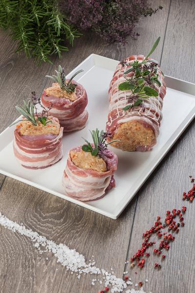 Bauchspeck umwickeln, frische Rosmarinzweige drauf legen und mit einem Bratennetz zusammenbinden.