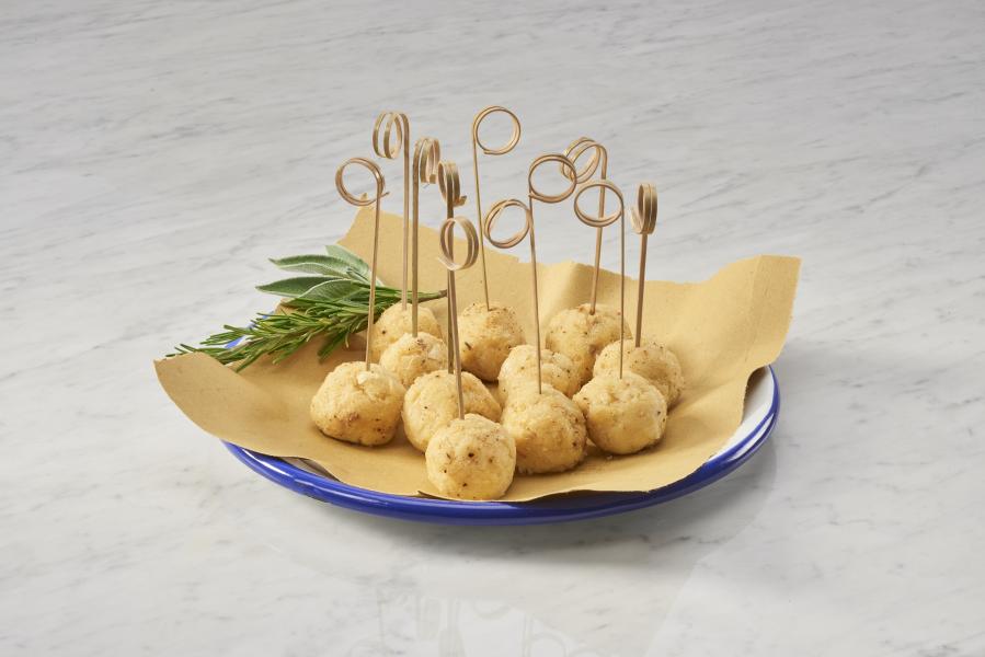 Die Knoblauchzehe fein zerdrücken und Saatöl dazugeben. Èbaccalà in einer Schüssel mit Fiokki, Parmesan und dem Knoblauchöl vermischen. Salzen und pfeffern und die Masse mit der Hand verrühren.