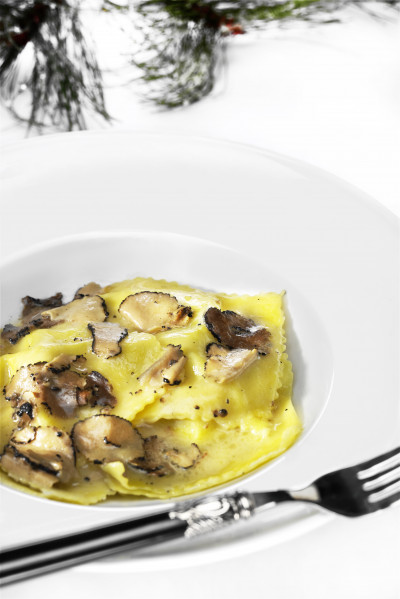 Das Mehl mit den Eiern und einer Prise Salz auf dem Backbrett verkneten, dann den Teig in Frischhaltefolie gewickelt eine halbe Stunde ruhen lassen. In der Zwischenzeit in einer Schüssel die Kürbiscreme mit dem Birnen-Ingwer-Dip, dem geriebenen Parmesankäse und den fein gehackten Makronen vermengen. Mit etwas Salz würzen und die Mischung mindestens eine Stunde ruhen lassen, damit sie kompakt wird. Nun rollen Sie den Teig aus und füllen ihn mit der Kürbisfüllung. Mit weiterem Teig bedecken und Ravioli formen, die an den Rändern sorgfältig verschlossen werden. Die Ravioli in reichlich Salzwasser bissfest kochen, abgießen und mit Butter und Trüffel-Carpaccio in der Pfanne braten. Sofort servieren.