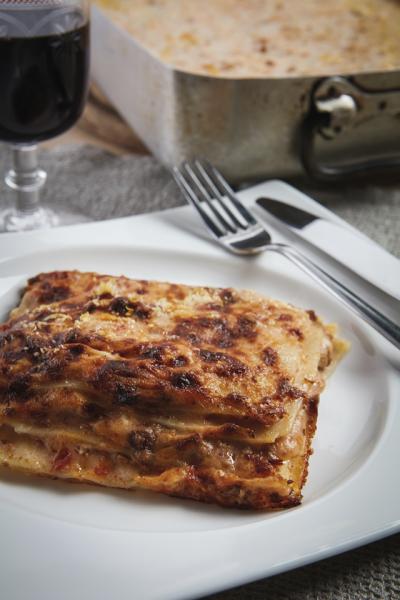 Die Nudelplatten in reichlich Salzwasser blanchieren und mit einem Tuch abtrocknen. In der Zwischenzeit die Milch in einem Kochtopf zum Kochen bringen und die weiße Roux darin auflösen; das Ragù del Norcino und den geriebenen Parmigiano hinzufügen. Aufkochen lassen und mit Salz und Muskatnuss würzen. Nun die Nudelrechtecke auf dem Boden einer Auflaufform verteilen, die Bechamelsauce mit dem Ragù und dem Parmesan bestreichen. Mit weiteren Nudelrechtecken bedecken und die Füllung wiederholen, bis 4-5 Schichten entstanden sind. Zum Schluss mit geriebenem Parmesankäse bestreuen. Die Lasagne im Backofen bei 180°C etwa 45 Minuten backen.