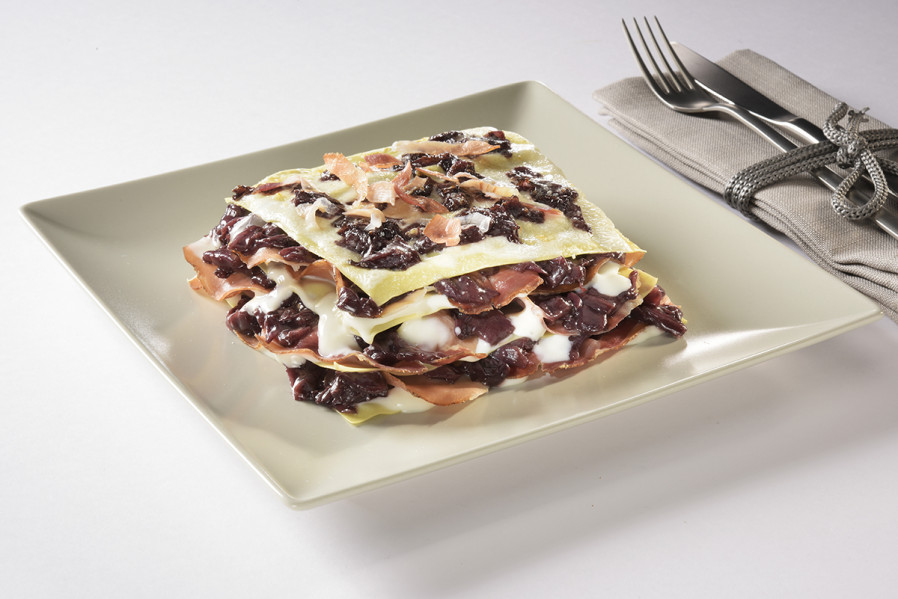 Nudelteig ausrollen und in große Rechtecke schneiden, kurz in reichlich kochendes gesalzenes Wasser geben und auf einem Tuch trocknen lassen. In der Zwischenzeit die Milch in einem Topf zum Kochen bringen und die helle Mehlschwitze einrühren. Die Sauce mit rotem Radicchio und den geriebenen Parmesankäse dazugeben. Mit geriebener Muskatnuss und einer Prise Salz würzen. Nun den Boden einer rechteckigen Gratinform mit Teigplatten auslegen, die vorbereitete Béchamelsauce mit Radicchio, den Speck und den geriebenen Parmesankäse darauf verteilen. Mit weiteren Teigplatten abdecken und auf diese Weise 4 oder 5 Schichten bilden. Zum Abschluss mit geriebenem Parmesankäse bestreuen. Die Lasagne etwa 45 Minuten bei 190 °C im Ofen gratinieren.