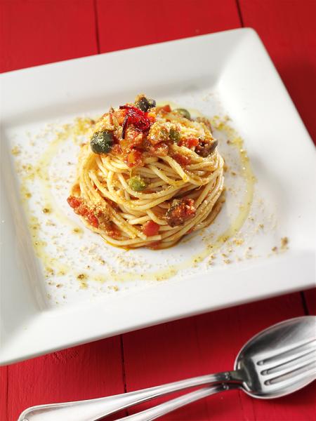 Die Spaghetti in reichlich Salzwasser kochen. In einer Pfanne das Paniermehl mit etwas Öl, gehacktem Knoblauch und Sardellen rösten. Wenn die Nudeln gekocht sind, in der Pfanne mit der Zigeunersauce schwenken. Zum Servieren die Spaghetti in die Mitte geben, mit ein paar gebratenen Chilifilets garnieren und mit gerösteten, aromatisierten Semmelbröseln bestreuen.