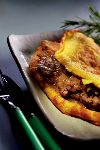Lavare accuratamente i fegatini, tagliarli in pezzi e farli saltare in padella insieme a 50 g. di burro e alla foglia di salvia. Bagnare con il marsala, salare, pepare e cuocere per qualche minuto. Scolare i porcini dall’olio della confezione e aggiungerli ai fegatini unitamente al trito d’aglio e prezzemolo: lasciare insaporire sul fuoco per qualche altro minuto. Nel frattempo in una ciotola battere energicamente le uova, aggiustando di sale e pepe. In una capiente padella antiaderente, sciogliere poi i rimanenti 50 g. di burro insieme a un poco d’olio; quando il composto comincerà a fumare versarvi le uova e cuocere da entrambi i lati per ottenere l’omelette. Su di un piatto da portata sistemare la frittata versandovi al centro l’intingolo precedentemente preparato; ripiegare l’omelette su sè stessa, irrorandola con il sugo rimasto e servirla ben calda.
