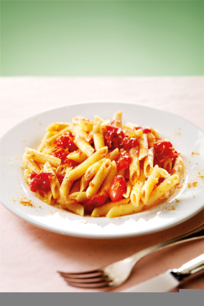 Die Penne in reichlich Salzwasser bissfest kochen. In der Zwischenzeit in einem Topf die Sauce aus Datteltomaten zusammen mit etwas Nudelkochwasser erhitzen. Die Zitronenschale abreiben, dabei darauf achten, dass nur der gelbe Teil entfernt wird. Die Mezze-Penne abtropfen lassen und in der Dattel-Tomatensauce schwenken. Die Nudeln auf die Teller verteilen und mit dem Rogen und der geriebenen Zitronenschale bestreuen.