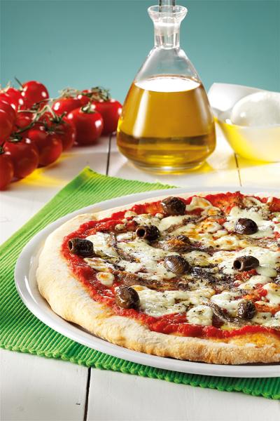Spalmare sul disco di pizza, la polpa di pomodoro Polpavera mescolata con la Salsadoro. Quindi distribuirvi sopra la mozzarella, i filetti di acciughe, le olive nostraline e l’origano.