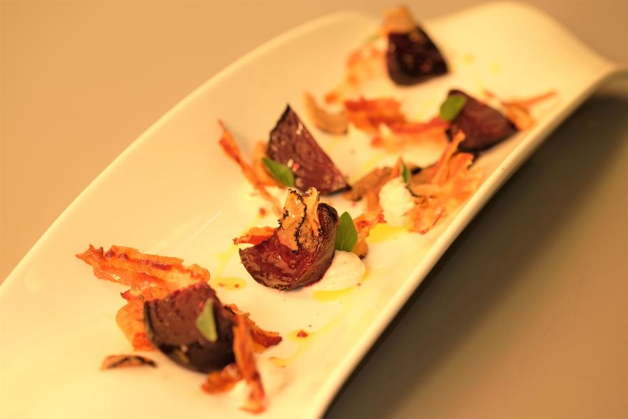 Lavare le rape per eliminare eventuale terra, arrostirle in forno a 180˚C per il tempo necessario. lasciare raffreddarle, pelarle e tagliarle a pezzi. Abbrustolire la pancetta. In una padella saltare i porcini con un filo d'olio e un rametto di origano. Condire le rape con olio, sale, pepe e farle rosolare in forno per qualche minuto. Nel frattempo montare la panna, incorporare la robiola e la crema tartufata. In un piatto posizionare la mousse di robiola con tartufo in diversi punti, appoggiare i tranci di rape su di essi, mettere qualche porcino e delle foglioline di origano. Ultimare con il carpaccio di tartufo, la pancetta croccante e un filo di olio extra vergine.
