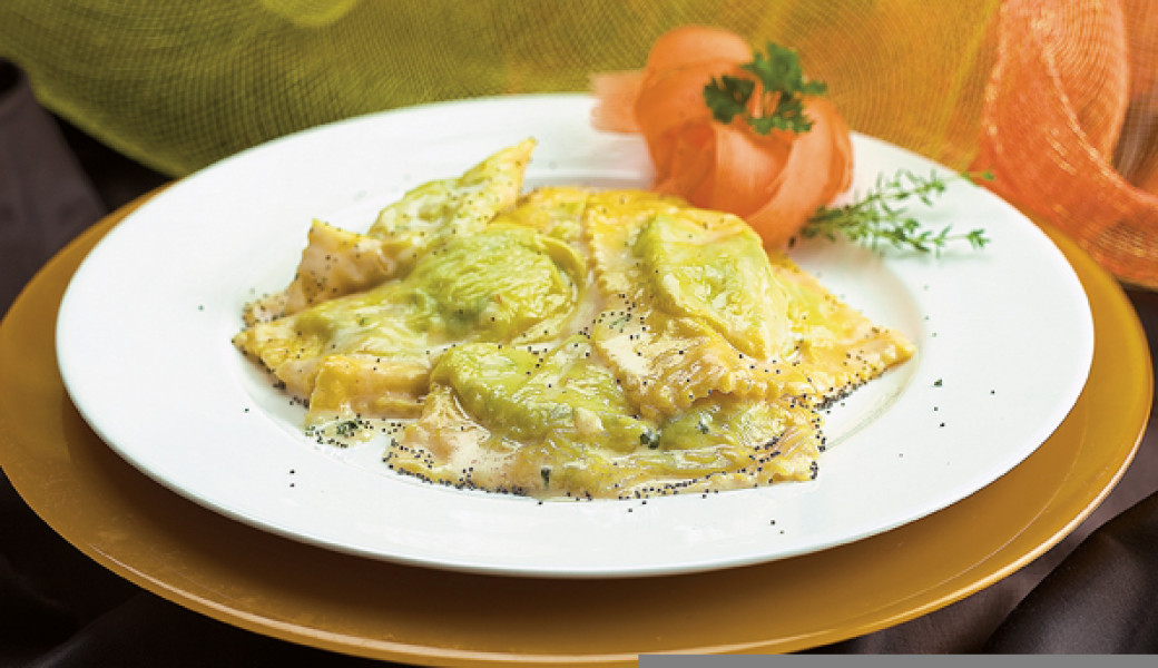 Das Mehl in einem Haufen auf ein Backbrett geben und die Eier hineinschlagen. Kneten, zunächst mit Hilfe einer Gabel, dann mit der Hand, bis ein glatter, homogener Teig entsteht. Etwa eine Stunde lang an einem kühlen, trockenen Ort ruhen lassen, in Frischhaltefolie eingewickelt, damit er nicht austrocknet. In der Zwischenzeit die Füllung zubereiten: Ricotta, 100 g Parmesan, Brennnesselcreme, Salz, Pfeffer und Semmelbrösel vermischen. Den Teig dünn ausrollen und in zwei etwa 10 cm breite Streifen teilen, kleine Teigportionen mit großem Abstand auf einen Streifen legen und dann den anderen überlappen lassen, so dass die beiden Teigblätter zusammenkommen. Mit einem Teigausstecher Quadrate von etwa 4x4 cm ausschneiden. Wenn die Ravioli fertig sind, kochen Sie sie sofort in reichlich kochendem Wasser und würzen sie mit zerlassener Butter, etwas Parmesan und Mohnsamen.