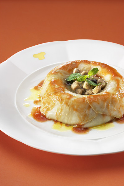 Bereiten Sie die Fischbrühe vor, indem Sie das Menüprodukt in einem halben Liter kochendem Wasser verdünnen, das mit den Petersilienstielen aromatisiert ist. Den Knollensellerie mit Hilfe eines Allesschneiders dünn schneiden. In einer beschichteten Pfanne einen Esslöffel natives Olivenöl extra erhitzen und die Knollensellerie-Scheiben anbraten, ohne sie zu anzubrennen. Dann auf saugfähigem Papier trocknen. Die einteiligen Savarinformen mit den Knollensellerie-Scheiben auslegen. In der Zwischenzeit die Datterini-Tomaten verquirlen und durch ein Sieb geben, dann das Tomaten-Zabaglione mit einem Faden von 50 g verquirlen. Natives Olivenöl extra hinzufügen. Blanchieren Sie nun die Minze in kochendem Wasser und mischen Sie sie dann mit 100 g Natives Olivenöl extra. Filtern Sie das aromatische Gewürz, indem Sie es durch ein Tuch gießen. Zu diesem Zeitpunkt in reichlich kochendem Wasser die Nudelringe al dente kochen. In einem Topf den gehackten Knoblauch und die Petersilie mit etwas nativem Olivenöl extra anbraten, dann den mediterranen Schwertfisch und die zuvor zubereitete Fischbrühe hinzufügen. Lassen Sie die Anelletti abtropfen und werfen Sie sie in die Fischsauce. Achten Sie darauf, dass Sie etwas von der Sauce beiseite lassen. Füllen Sie die Einzelportionsformen mit Schwertfischnudeln und backen Sie sie zehn Minuten lang bei 200 ° C. Den Anelletti-Savarin auf einem Teller verteilen, in der Mitte die Sauce mit dem Schwertfisch, dann mit der Datterini Zabaglione und mit ein paar Tropfen Minzöl abschließen.