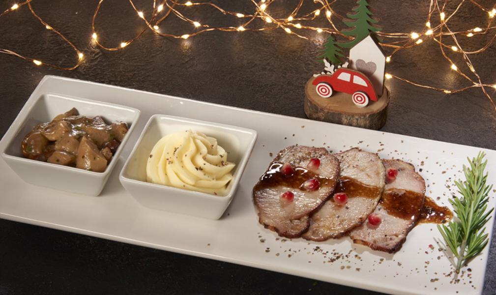 Den Schweinebraten in Scheiben schneiden und diese ein paar Minuten lang mit etwas Öl in der Pfanne anbraten. Demi Glace nach Packungsanleitung zubereiten. In der Zwischenzeit 250 ml Salzwasser in einem Topf zum Kochen bringen. Die Milch und die Kartoffelflocken einrühren. Wenn das Püree cremig ist, die Butter und den Parmesan einrühren. Die Gran Boletus Pilze kurz mit Öl, Knoblauch und Petersilie in einer Pfanne anbraten. Die angebratenen Fleischscheiben mit der Demi Glace auf dem Teller anrichten. Die Pilze in ein Schälchen geben und das Püree mit einem Spritzbeutel in ein zweites Schälchen dressieren. Mit Granatapfelkernen, grob gemahlenem buntem Pfeffer und einem Rosmarinzweig garnieren.