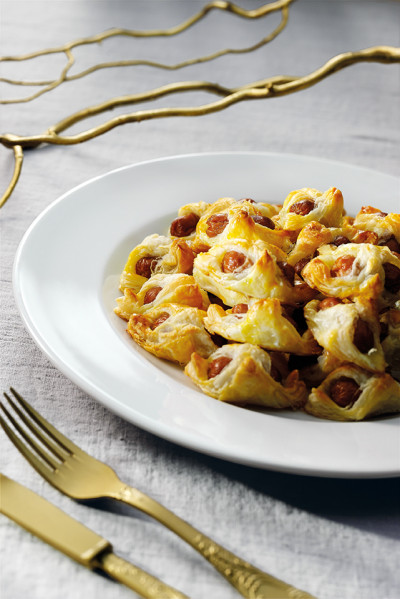 Con l'aiuto del mattarello stendere la pasta sfoglia e tagliarla a quadretti. Scolare i wurstel dal loro liquido di governo e rivestirli ciascuno con un quadretto di pasta in modo da formare dei fagottini. Spennellare la superficie delle sfogliatine con l'uovo battuto e infornare a 180° per circa 20 minuti. Servire le sfogliatine fredde o tiepide come antipasti o stuzzichini.
