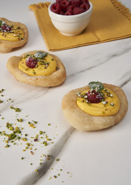 Pizzateig frittieren, abtropfen lassen und mit Katalanischer Creme (zuvor nach Packungsanleitung zubereitet), Himbeeren, Gehackten Pistazien und Puderzucker garnieren.