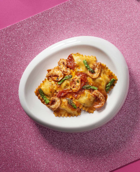 Den Ricotta-Käse mit der aseptischen Grancrema mit Spargeln, den Fiokki und dem geriebenen Parmesankäse in einer Schüssel vermengen. Mit ein wenig Muskatnuss und einer Prise Salz würzen. Das Mehl auf das Nudelbrett geben und mit den Eiern zu einem glatten und homogenen Teig verkneten. Mit Hilfe des Nudelholzes dünn ausrollen, dann in Streifen schneiden. Die so entstandenen Streifen mit der vorbereiteten Füllung füllen und mit einem weiteren Teigstreifen überlappen. Mit einem Teigschneider zu Ravioli ausschneiden. In einer Pfanne etwas Öl und den gehackten Knoblauch anbraten. Die halbierten Scampi und die gehackte Petersilie hinzugeben. Ein paar Minuten anbraten, dann die Bisque aus Krustentieren und die roten Datteltomaten zugeben und weitere 5 Minuten kochen lassen. Die Ravioli in reichlich Salzwasser kochen, abgießen und in der Scampi-Sauce schwenken. Servieren und mit den halbierten und in etwas Öl geschwenkten Spargelspitzen garnieren.