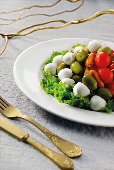 Lavare con cura i pomodori ciliegini; scolare le olive giganti e i mini wurstel dal loro liquido di conservazione. A questo punto preparare gli spiedini intercalando sullo stecchino i vari ingredienti. Decorare con foglie di lattuga e servire insieme all'aperitivo.