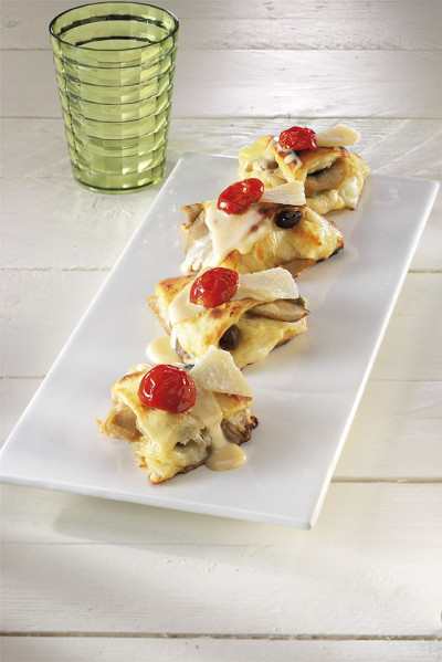 Stendere l'impasto in forma ovale. Farcirlo con la mozzarella, le Olive nostraline e i Porcini. Arrotolarlo e tagliarlo a triangoli. Metterlo in teglia e cuocerlo in forno. In uscita aggiungere su ogni triangolino la Grancrema al Parmigiano con un cucchiaio e decorare con una scaglietta di parmigiano reggiano e un pomodoro Dorato Menù.