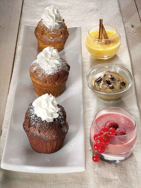 Impastare tutti e tre i preparati in polvere per torte menù con le modalità indicate nelle confezioni. Versare i composti negli stampi da muffin precedentemente imburrati (circa 50 g. ognuno) e cuocere i muffin in forno preriscaldato a 180°C per circa 10 minuti. Nel frattempo preparare a parte le tre salse d'accompagnamento. Preparare la crema inglese come indicato in confezione, dividere in tre parti il composto e miscelarlo distintamente con la cannella in polvere, con il caffè in polvere, con la glassa ai frutti di bosco, regolando le quantità in base al proprio gusto. Sfornare e servire i muffin accompagnati dalle loro salse: base torta margherita con la crema inglese al caffè, base torta mandorle con la crema inglese alla cannella, base torta cioccolato con la crema inglese ai frutti di bosco.