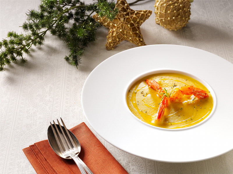 In una padella rosolare lo scalogno e a seguire le Patate tagliate a cubetti. Far rosolare per alcuni minuti poi aggiungere il Buon Brodo, continuando la cottura per circa 20 minuti. Tritare il tutto a crema con un frullatore a immersione e incorporare la Crema di zucca. Aromatizzare con un po’ di rosmarino tritato e aggiustare di sale e pepe. Versare la vellutata nei piatti e completare la presentazione posizionando al centro i gamberi precedentemente saltati in padella con olio extra vergine d’oliva. Decorare con un ciuffo di rosmarino ed un filo d’olio.