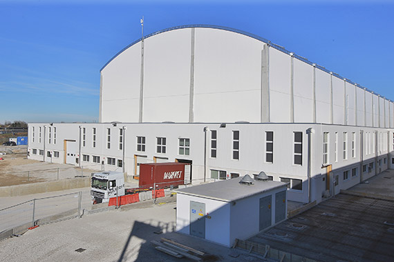 26 meters high, 46 meters wide with a single aisle, 29000 pallet posts, it is one of the largest warehouses in Italy. It boasts a special design with a round dome and large exposed pillars tapering towards the top. 1000 poles, 22 meters long, stuck into the ground, hold up the weight, making it steady under any loading condition and ensuring safety on a ground which otherwise would be unable to hold up such loads.