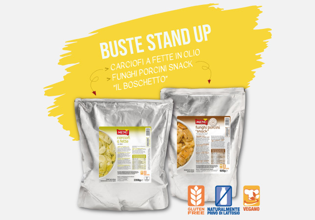 Sliced artichokes in oil and “Il Boschetto” Porcini Mushroom Snack have a new look with the innovative Stand-Up Bags!