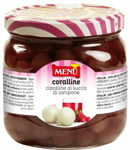 Pearl onions packed in raspberry juice. Sweet and sour product ready to serve. Ideal for appetisers, aperitifs, salads, buffets and side dishes.