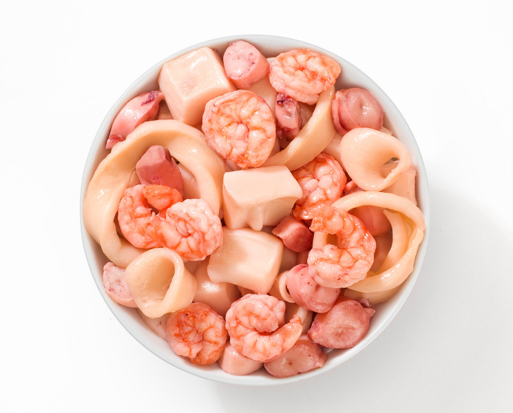 A combination of top quality raw materials, selected for their size and quality: cuttlefish medallions of squid, squid ribbons and rings, striped prawns. Ready to serve, the product is perfect for cold appetizers. Èmaremix does not contain vinegar and can also be widely used in the preparation of pasta and risotto dishes, pizza or soups. Èmaremix liquid can be used as a stock in risotto, soup and pasta for 100% yield.