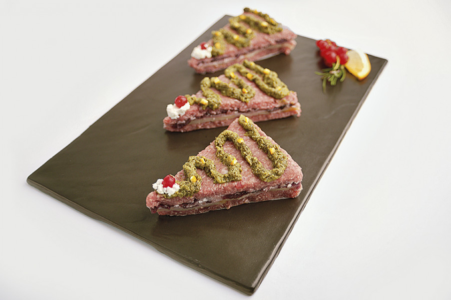 Impastare il macinato con i Fiokki di patate e il Sale alle erbe e lasciare riposare 10  minuti. Addensare la Salsa di radicchio con i Fiokki di patate e la ricotta. Stendere la carne in un foglio rettangolare e coprire con le fettine di scamorza. Aggiungere la salsa ottenuta e piegare la carne a metà. Ricavare quattro triangoli e decorarli con crema di friarielli e un chicco di ribes. Cuocere in forno per 10 minuti a 180°C.