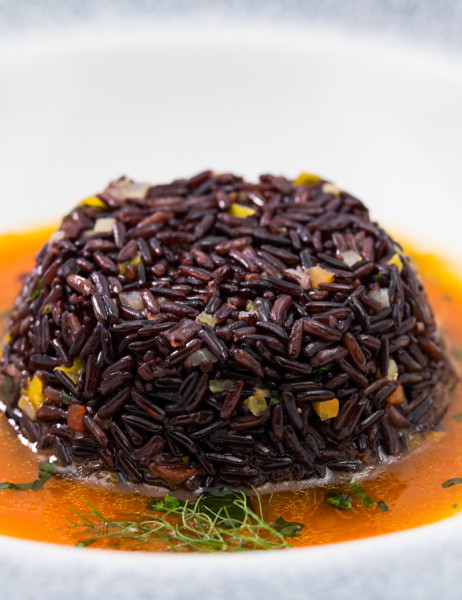 Drizzle some oil in a pan and brown some chopped garlic. Add the parsley and bisque, then dilute with some water. Warm the timbale in the oven for 15-20 minutes, then turn it onto the serving dish and add the flavoured Èbisquedicrostacei. Garnish with wild fennel, a drizzle of evoo and serve!