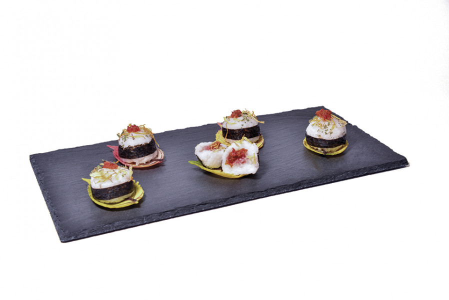 Mescolare la Salsa di fuoco con la ricotta e la battuta di carne. Inserire il composto ottenuto all’interno della bombetta di riso. Aggiungere una strisciolina di Alga Nori intorno alla bombetta e decorare con Petali di calendula ed Erba cipollina liofilizzata.