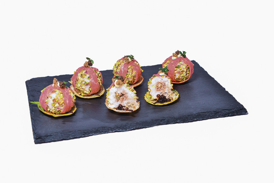 Mescolare il Tonno con la Crema di olive verdi e la Crema di olive nere. Inserire il composto ottenuto all’interno della bombetta. Ricoprire la bombetta con le fettine di carne e decorare con Maionese della casa, granella di pistacchio e perline di Aceto Balsamico.
