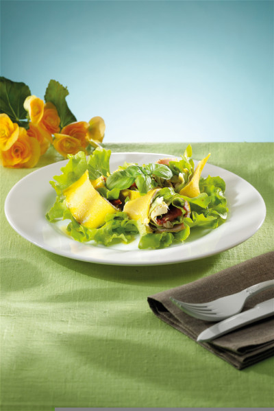 In a bowl mix the crêpes powder with 400 g. of water; in a non stick pan pour the mixture obtained to make six crepes with a diameter of about 25 cm. Leave the crêpes to cool, then spread the mayonnaise over them, the slices of ham, lettuce , tomato wheels and finely the artichokes(previously sliced). Season with a pinch of salt, then roll the crêpes and let them rest in the refrigerator for an hour. At this point, blend the extra virgin olive oil with the fresh basil. Spread the lettuce leaves on the plate and the crêpes, cut into 3 pieces, on top. Complete with a drizzle of the basil olive oil.