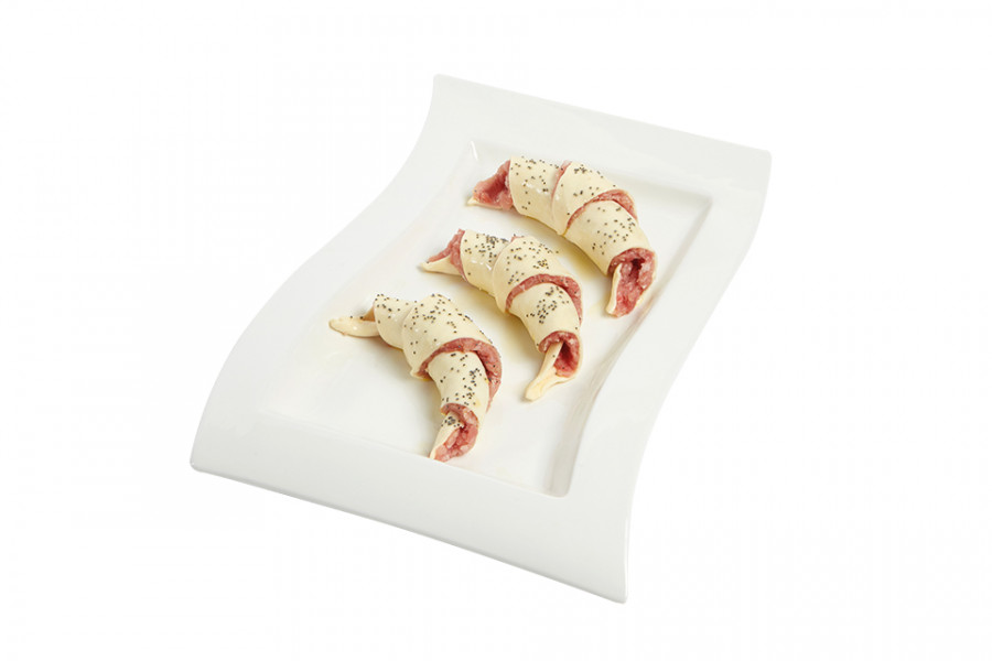 Macinare la carne, quindi impastarla con il Parmigiano Reggiano, la Gransalsa di porro, la Grancrema di scamorza affumicata, i Fiokki ed aggiustare di sale e pepe. Stendere la pasta sfoglia e adagiarvi le fette di prosciutto cotto. Aggiungere il ripieno preparato, disponendolo in modo omogeneo sulla base di pasta sfoglia, ricoprendola interamente. Tagliare la pasta sfoglia farcita in 8 spicchi. Arrotolare ogni spicchio creando un croissant. Spennellare la superficie con albume d'uovo e decorare con semi di papavero.