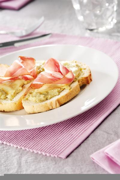 In una padella tostare leggermente le fette di pane toscano insieme a un poco d'Olio extravergine di oliva. Distribuire la Grancrema di carciofi sulle fette di pane, quindi accomodarvi sopra le fette di scamorza affumicata. Gratinare in forno per alcuni minuti. Sfornare e completare la farcitura dei crostoni con le fette di speck. Servire subito.