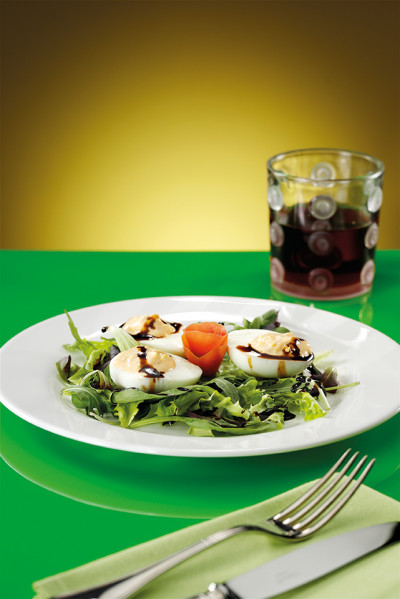 In plenty of water, boil the eggs until firm, then let them cool and peel them. Cut the eggs in half lengthwise and remove the yolk. In a bowl mash the egg yolks and mix it with the salsadoro and the mayonnaise, transfer this mixture into a pastry bag and stuff the eggs with it. Season the mix lettuce and place in the center of a plate with the stuffed eggs on top. Garnish with fresh tomato wedges and a drizzle of the PDO balsamic vinegar.