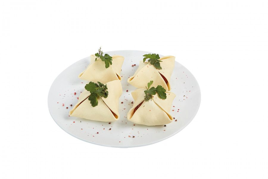 Macinare la carne. Impastare la carne con il Parmigiano Reggiano, la Crema di rosmarino, i Fiokki ed aggiustare di sale e pepe. Con l'impasto ottenuto realizzare delle polpettine. Stendere la pasta sfoglia e ricavarne 6 quadrati per confezione. Adagiare 10 g di prosciutto cotto e mezza fetta di Emmenthal su ogni quadrato di sfoglia. Ultimare con una polpetta di carne leggermente schiacciata. Chiudere la sfoglia unendo i quattro angoli ed ottenere così dei fagottini. Chiuderli con erbe aromatiche e decorare a piacere.