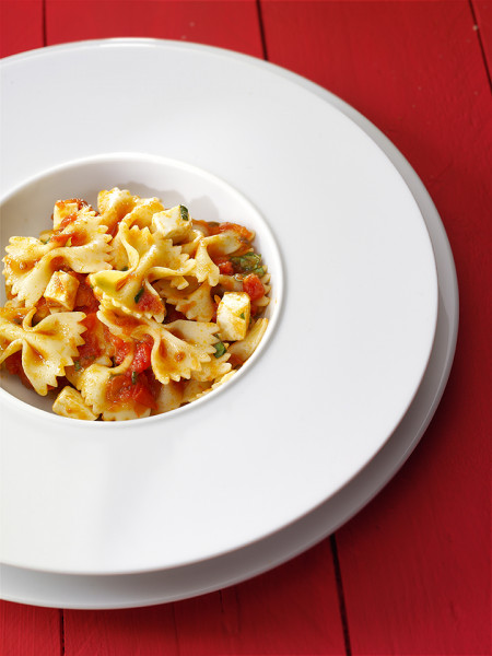 Cook the farfalle pasta in boiling salted water. When the pasta is cooked, toss it in a pan with the pomosilico sauce. Remove the pan from the heat, add the mozzarella cut into cubes and the fresh chopped basil. Serve with a drizzle of basil infused extra virgin olive.